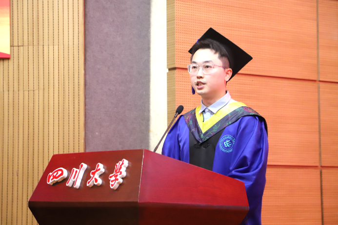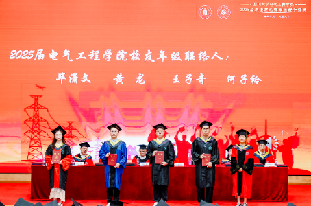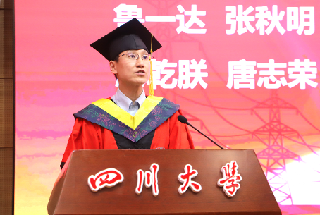 四川省优秀大学毕业生、2025届硕士毕业生黄龙同学代表全体毕业生向公司、公司及老师们致以诚挚的感谢与敬意。他讲述了自己从参与到带团队开展“专业+志愿”的实践活动经历,以及受到“时代楷模”国网成都高新连心桥党员服务队感召实现专业与社会责任融合的感悟。他号召毕业生们秉持担当,在能源电力、智能制造领域贡献川大电气学子的力量。