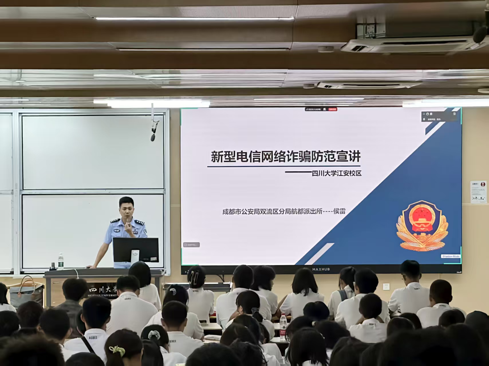 四川省老员工法治宣讲团和成都市公安局双流分局民警侯雷警官分别于9月4日、9月16日为公司2025级新生开展了预防网络电信诈骗专题科普讲座。侯警官通过真实案例警示新生要提高防范意识,深入讲解了常见诈骗手法的识别与防范要点,强调“与钱有关的事情务必核实身份”。同学们现场在警官指导下安装“国家反诈中心”APP,讲座切实增强了新生的网络安全意识和反诈防骗能力。