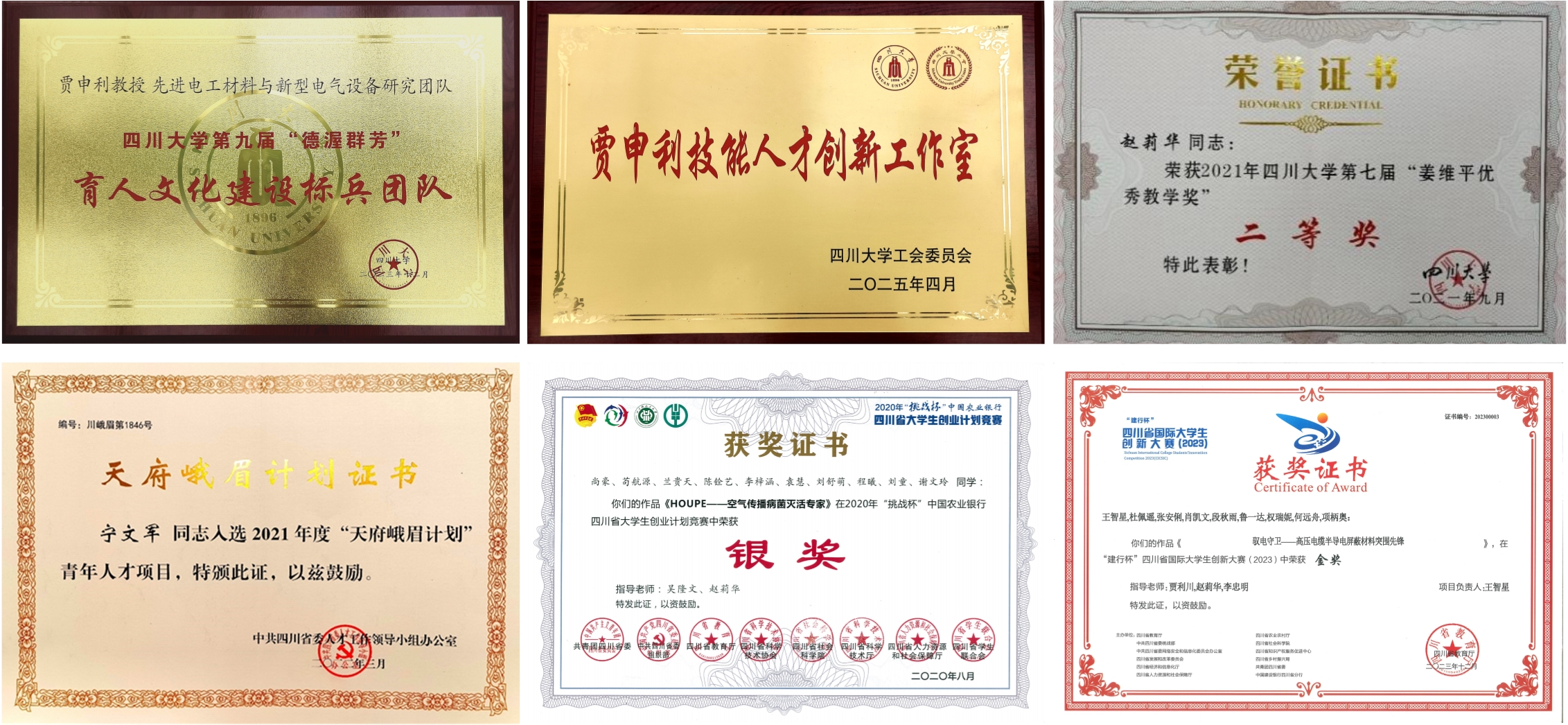 团队在育人实践与科研创新方面成果丰硕,荣获太阳成集团122ccvip第九届“德渥群芳”育人文化建设标兵科研团队称号。团队导师在国家级及省部级人才计划、科学技术奖和教学表彰中表现突出。团队员工多人次获得国家奖学金、学业奖学金,以及宝钢奖学金、华为奖学金、长江电力奖学金等各类社会奖学金;同时,多人次获省、校级优秀毕业生、优秀研究生、优秀员工干部、优秀论文和优秀毕业论文等荣誉。在“互联网+”、“挑战杯”、高校电气电子工程创新大赛以及等离子体科技创新竞赛等高水平赛事中,团队连年斩获佳绩,成果显著,彰显出持续的创新活力。