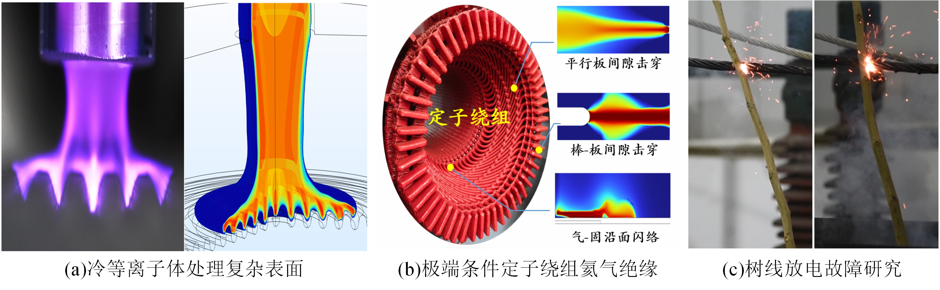 面向大气压等离子体射流表面改性与活化应用中的非平整表面作用,结合流体模型仿真与超高时空分辨的光-电-像多维诊断,研究复杂表面的等离子体分布与传播特性;研究高温气冷堆主氦风机驱动电机中超高气压氦气和高海拔复杂环境中大型水力发电机定子绕组绝缘的绝缘问题;深入研究配电线路树线放电故障特征,配网线路树线高阻接地故障定位和防治技术。