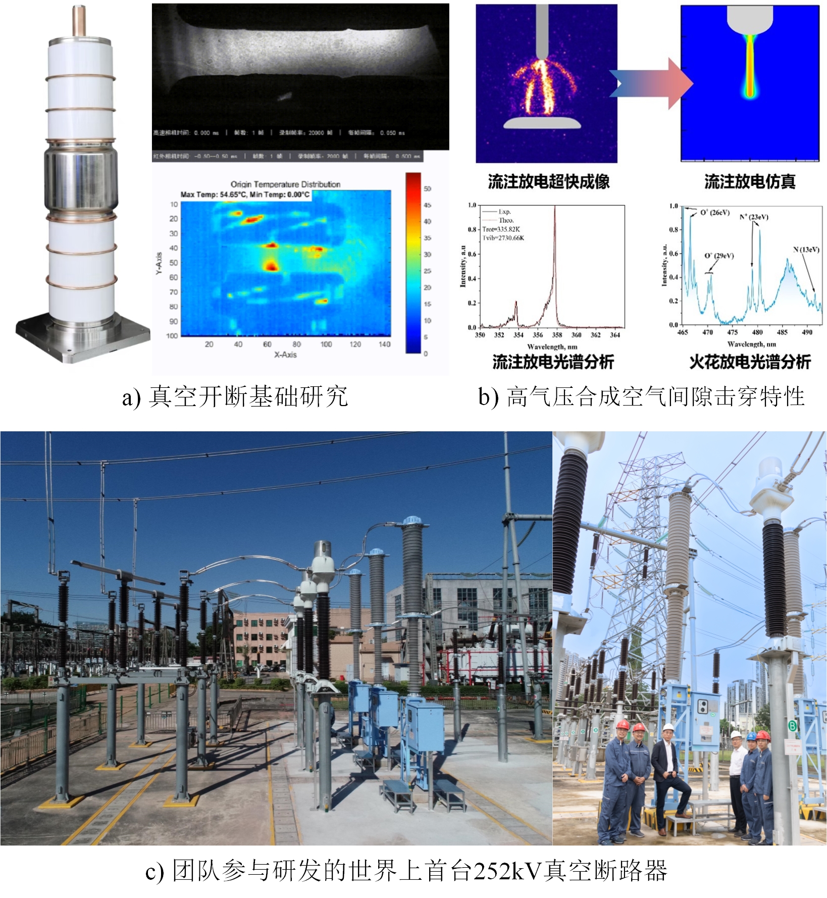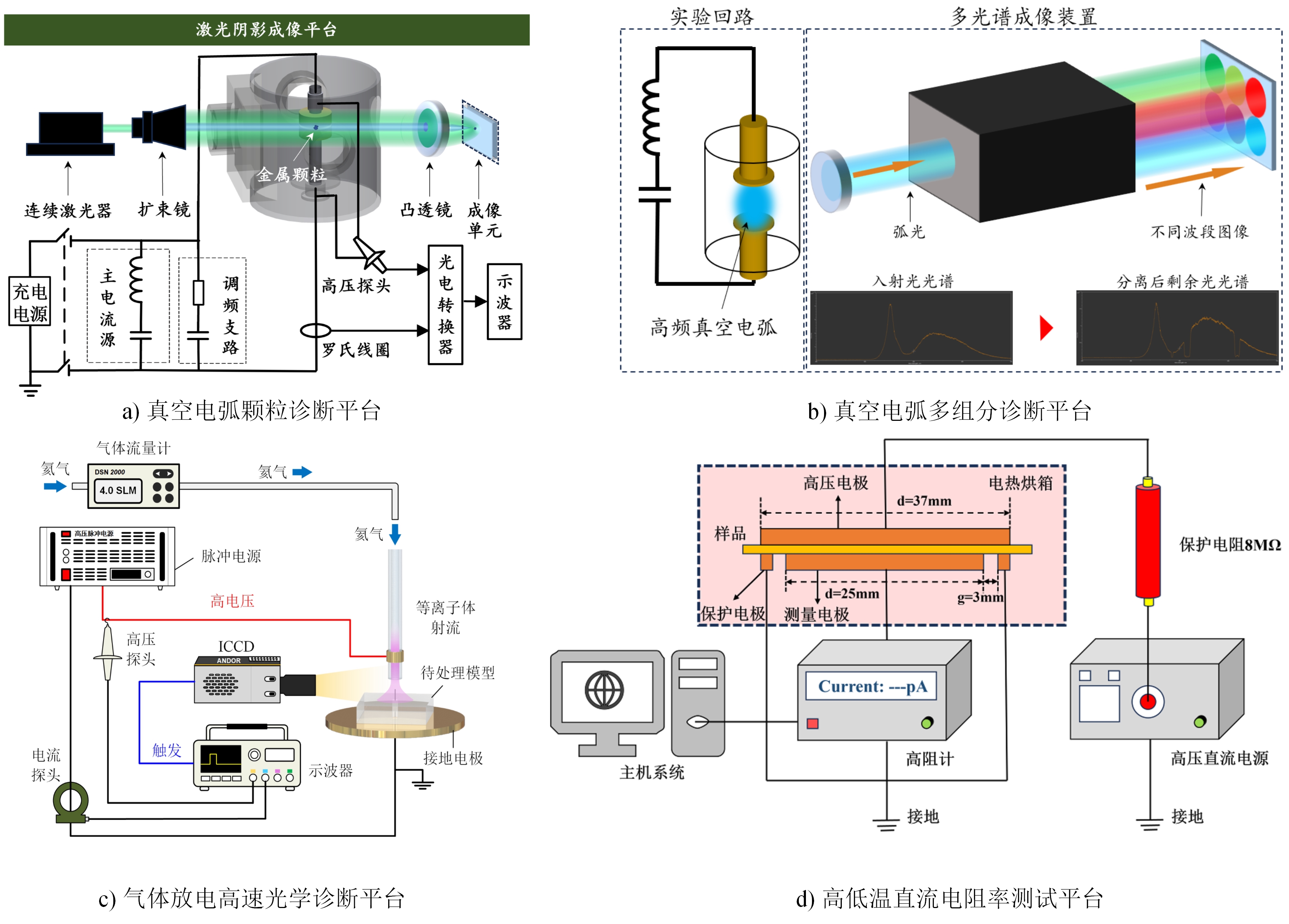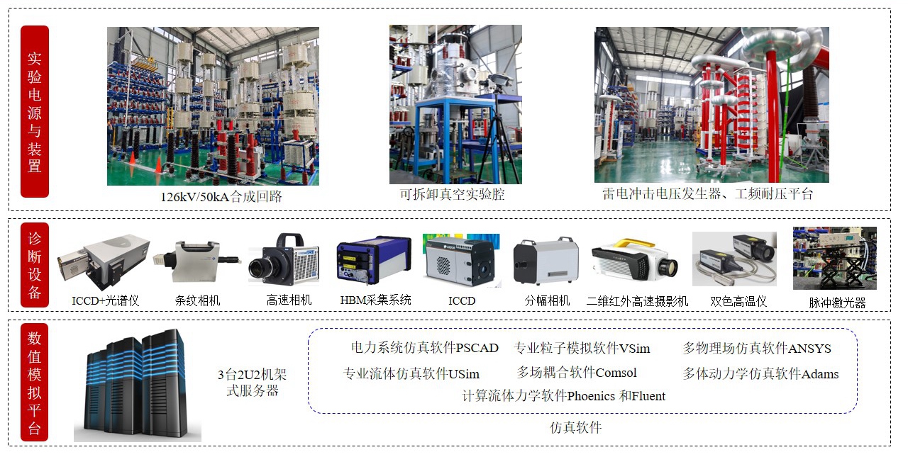 团队的实验电源、实验装置、诊断设备与相关数值模拟资源组成的研究平台在国内处于领先水平,可以进行大型、大容量、高电压以及电工材料相关实验。基于上述设备,团队师生研究搭建了真空电弧颗粒诊断平台、真空电弧多组分诊断平台、气体放电高速光学诊断平台以及先进电工材料测试实验平台。已建立的实验平台为真空开断基础理论研究、气体放电特性诊断、电工材料参数测试提供了充足的实验条件,也是团队师生进行科研训练、实现科研突破的基础。