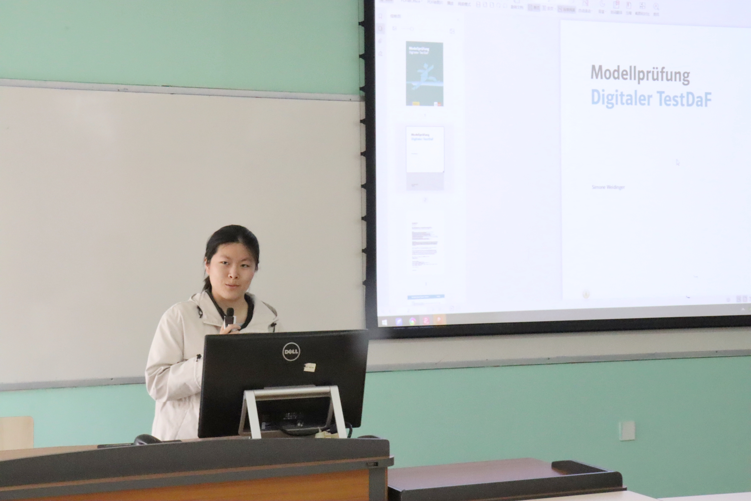 在分享会上,张同学先对 TestDaF、DSH 以及 telc C1 Hochschule 这三种被本项目认可的德语水平考试进行了简要介绍,接着说明了TestDaF考试的时间、地点及形式。随后,她以TestDaF模拟题为例,对阅读、听力、写作及口语四个板块进行了详细解读,包括题型介绍、难易程度分析等,并分享了自己的备考与应试经验。她建议学弟学妹们在德语学习中,应拓展课外阅读,结合语境理解单词;听力训练时,同步进行口语跟读练习;写作方面,则要注重日常积累。